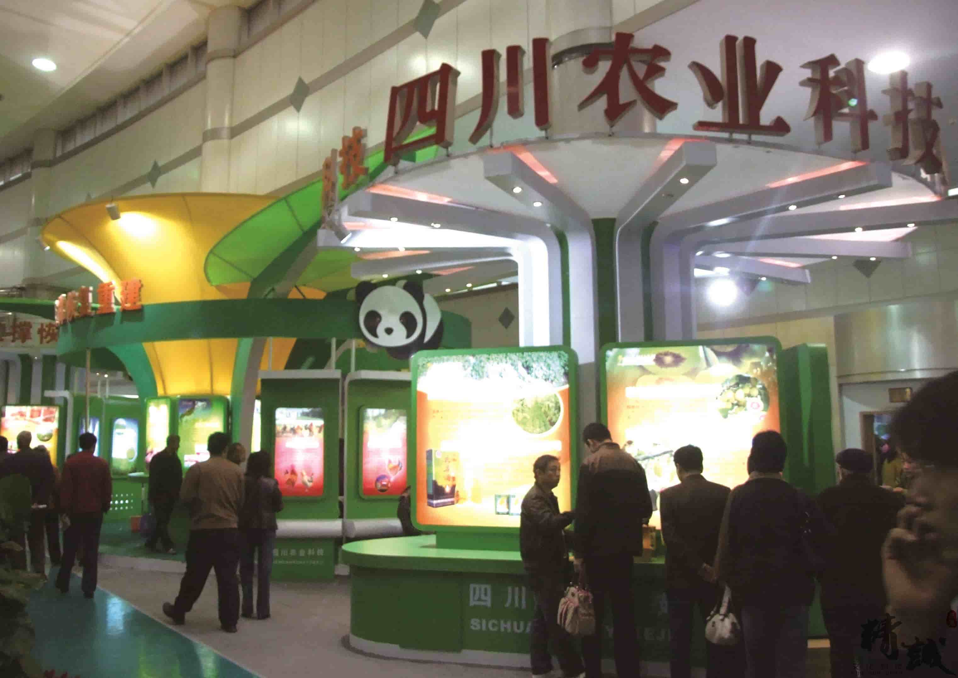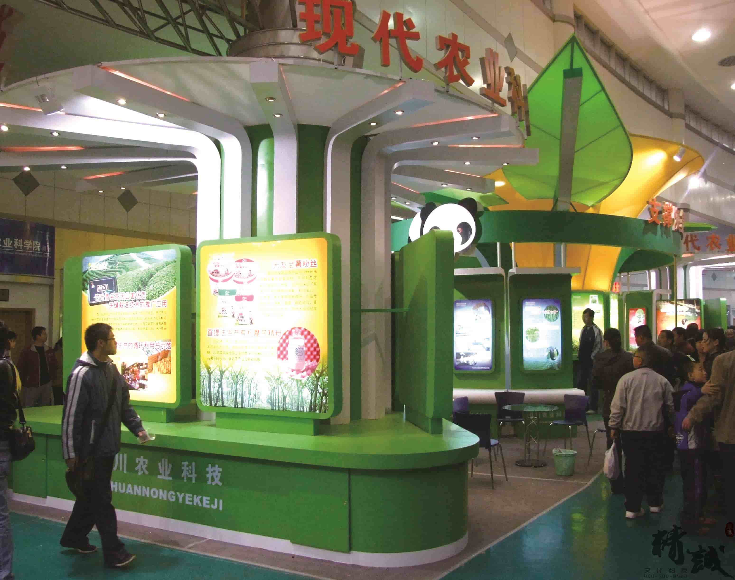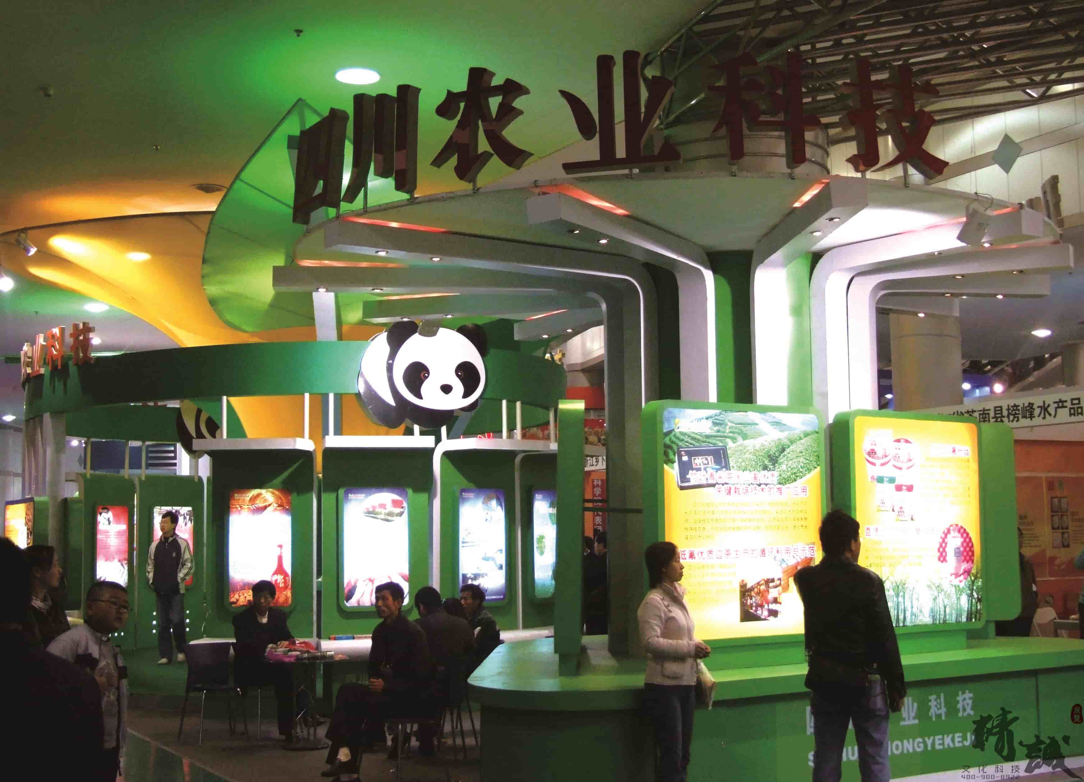 展位設(shè)計(jì)以綠色為主色,體現(xiàn)出四川綠色生態(tài)的現(xiàn)代農(nóng)業(yè);恰當(dāng)?shù)恼古_(tái)設(shè)計(jì),便于特色產(chǎn)品的展示;“國寶”熊貓雕刻畫裝飾,使得展位賦予了活潑與動(dòng)態(tài)感。整個(gè)展位突顯了四川的綠色、生態(tài)。