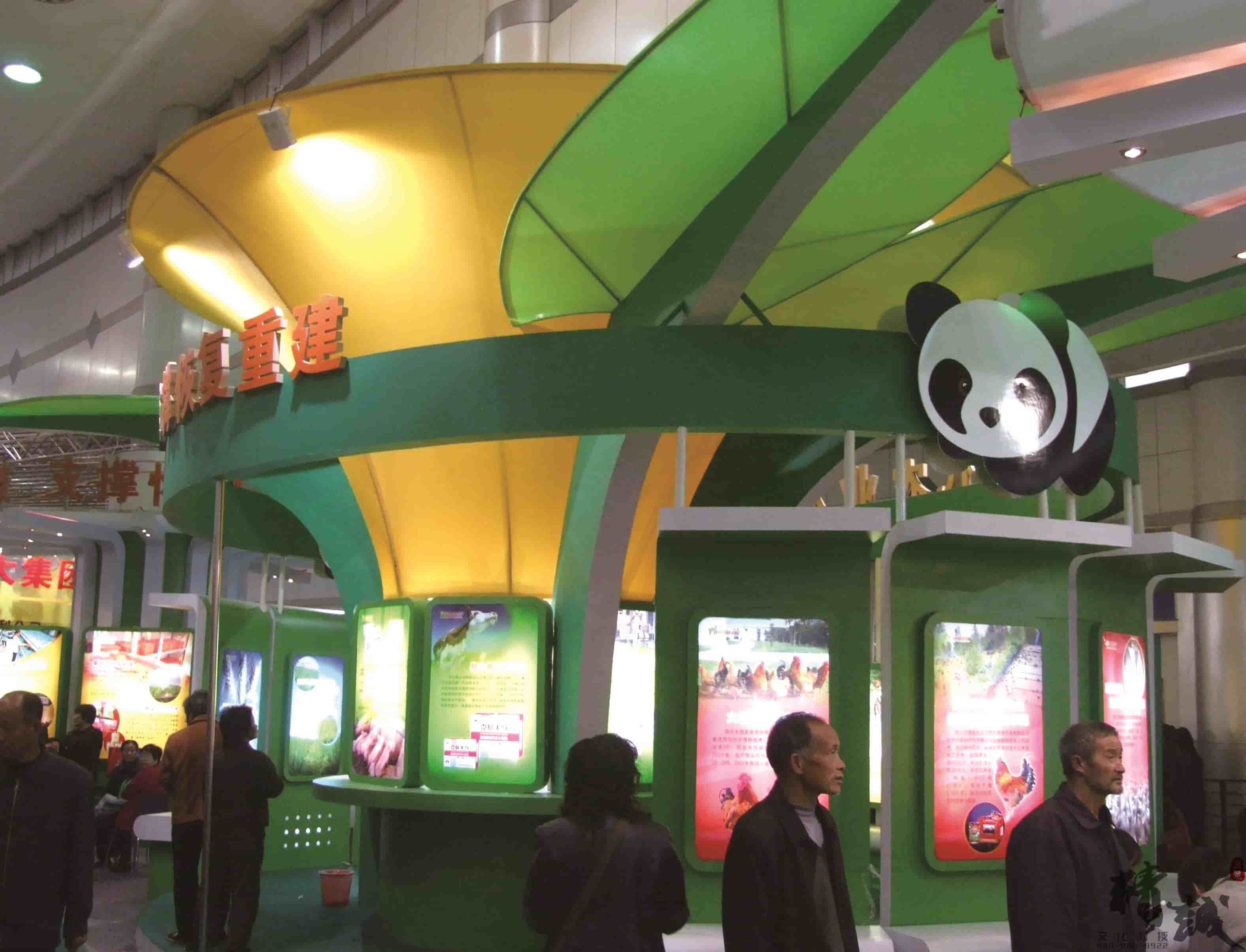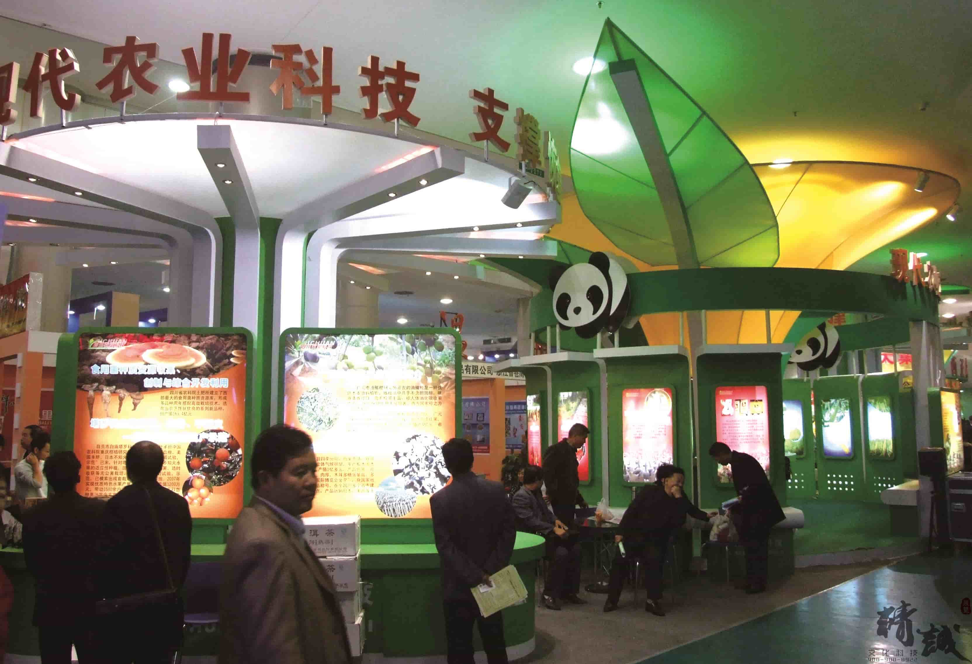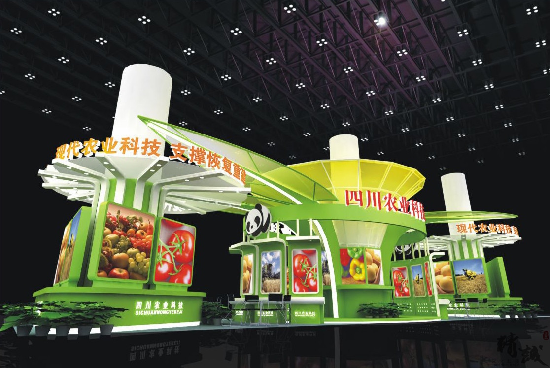 展位設(shè)計(jì)以綠色為主色,體現(xiàn)出四川綠色生態(tài)的現(xiàn)代農(nóng)業(yè);恰當(dāng)?shù)恼古_(tái)設(shè)計(jì),便于特色產(chǎn)品的展示;“國寶”熊貓雕刻畫裝飾,使得展位賦予了活潑與動(dòng)態(tài)感。整個(gè)展位突顯了四川的綠色、生態(tài)。